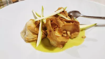 Karžlje je v Italiji dovoljeno nabirati in jesti, zato smo, ko so jih omenili, takoj naročili frtaljo z njimi (18 evrov). Frtalja na Opčinah ni podobna omleti, ampak jajca ostanejo skoraj tekoča, v vsakem primeru pa slastna. Košarice iz testa medtem napolnijo s porom, pinjolami in bučkino kremo ter spečejo, ta izvrstna predjed (12 evrov) lahko zadovolji tudi vegane, če je treba. Začetek štirih velikih in obilnih, nemajhnih predjedi je enostavno obetal. Je pa seveda zraven po svojih močeh pomagala tudi enostavna zelo popularna franciacorta Ca'del Bosco (55 evrov).