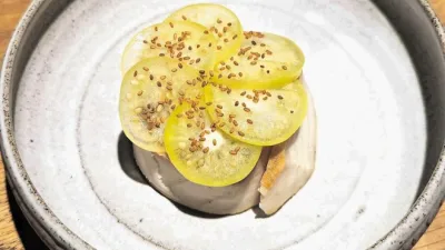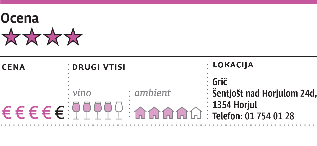 Grič ni več zgolj gostilna s šankom za domače pivce in prihod gostov ni več zaznamovan s šilcem domačega, ampak so zadeve bolj formalne. Zamudniki smo lovili sedemhodni degustacijski meni, ki so ga pravočasni že načeli. Pohiteti bo treba in jasno nam je bilo, da natančna spletna rezervacija ni bila naključje. Podobno ni bilo naključje, da so si na naši kartici že zagotovili 50 evrov na osebo, če slučajno ne bi prišli. Skratka, kakšne poudarjene domačnosti na Griču ne pričakujte. Zdaj je to restavracija z Michelinovo zvezdico, ki svoje delo jemlje zelo resno.