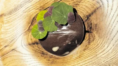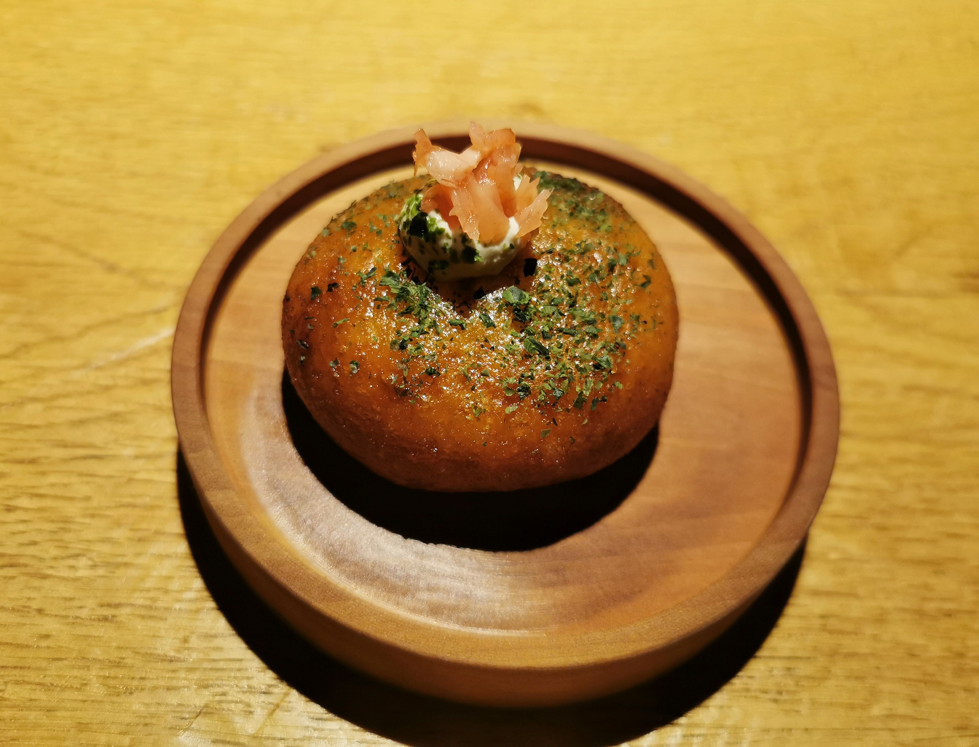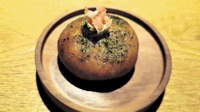 Vrnimo se k pozdravčkom, k z ogljem obarvani blazinici s kremo črnega česna in hrustljavim ohrovtom, pa k nabodalom s popečeno potrebušino zlatovčice. Na mizi sta bila tudi dimljena vratovina na kremi bezgovega sirupa in puri, po indijsko ocvrt kruhek z Orešnikovim sirom, kardamomom in vloženim motarjem. Nato je prispel ocvrtek, polnjen z muzgavci – hobotnicam podobnimi glavonožci – in popestren z ingverjem ter drobnjakom. Brandulinova malvazija se je s prvimi jedmi res dobro ujela. Tudi z jesetrom, regratom in zelenimi paradižniki ter s tatarcem iz jelenovega srca z gobicami, predelanimi drobtinami brioša, deteljico in kapucinkami, postreženimi na posrečenem lesenem krožniku.