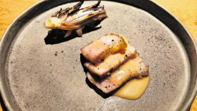 Heapsov štajerski modri pinot je bil medtem bolj tradicionalen spremljevalec naslednjih dveh jedi: najprej kroglic iz hokaido buče s čebulnim čipsom, Orešnikovim reblochonom in oljem figovih listov, nato pa rezin sočne svinjine s popečenim radičem.