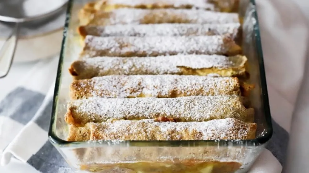 Gratinirane palačinke previdno vzemite iz pečice, počakajte minuto ali dve, nato pa jih potresite s sladkorjem v prahu, razdelite na porcije in postrezite.