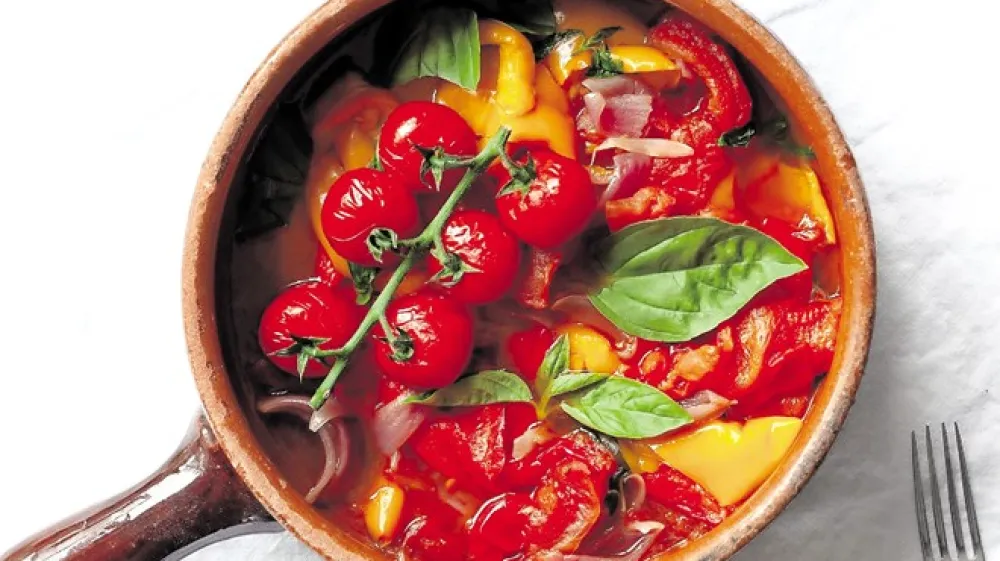 1Papriko, feferon in paradižnik operemo, očistimo in narežemo na kose. Čebulo narežemo, česen nasekljamo. V čim širšem loncu ali ponvi na maščobi opražimo čebulo. Ko postekleni, dodamo narezano papriko in feferon ter med mešanjem pražimo kakšnih 5 minut. Nato dodamo česen in ko zadiši, še narezan paradižnik. Začinimo s soljo in poprom ter dodamo lovorov list in po želji še kakšna zelišča. Premešamo in na majhnem ognju na pol pokrito dušimo 20–30 minut, da nekaj tekočine povre.