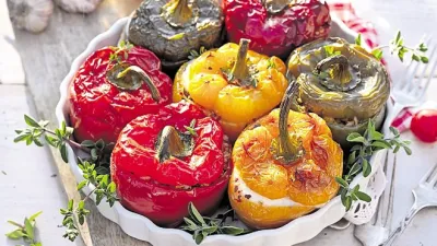 Kuskus prelijemo z 2,5 dl vrele vode, pokrijemo in pustimo 10 minut. Pečico segrejemo na 180 °C. Štirim paprikam odrežemo klobuke in jih previdno očistimo. Peto papriko skupaj z bučko drobno narežemo, podobno narežemo še sir. Paprike, bučke, oljke prelijemo s polovico olja, limonovim sokom in posujemo z origanom. Solimo, popramo in premešamo. Pet žlic mešanice skupaj s sirom primešamo kuskusu in nadevamo paprike. Manjši pekač namažemo s preostalim oljem in vanj porazdelimo preostalo zelenjavo. Nanjo postavimo paprike, pokrijemo in pečemo 40 minut. Ponudimo s solato.