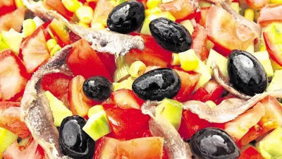Paradižnike in kumare dobro operemo. Kumare po potrebi olupimo in razsemenimo (pri majhnih in mladih ni treba). Oboje narežemo na podobno velike koščke in stresemo v veliko skledo. Čebulo olupimo, zelo drobno sesekljamo in stresemo v skledo. Koruzo odcedimo, oljke razkoščičimo in oboje dodamo v skledo. Solimo (pozor, slani so že fileti!), popramo, dobro pobrizgamo z oljem in kisom ter premešamo. Slane filete ločimo enega od drugega in jih razporedimo po solati, lahko pa jih tudi razkosamo in primešamo. Z dobrim kruhom lahko ponudimo tudi kot samostojno jed.