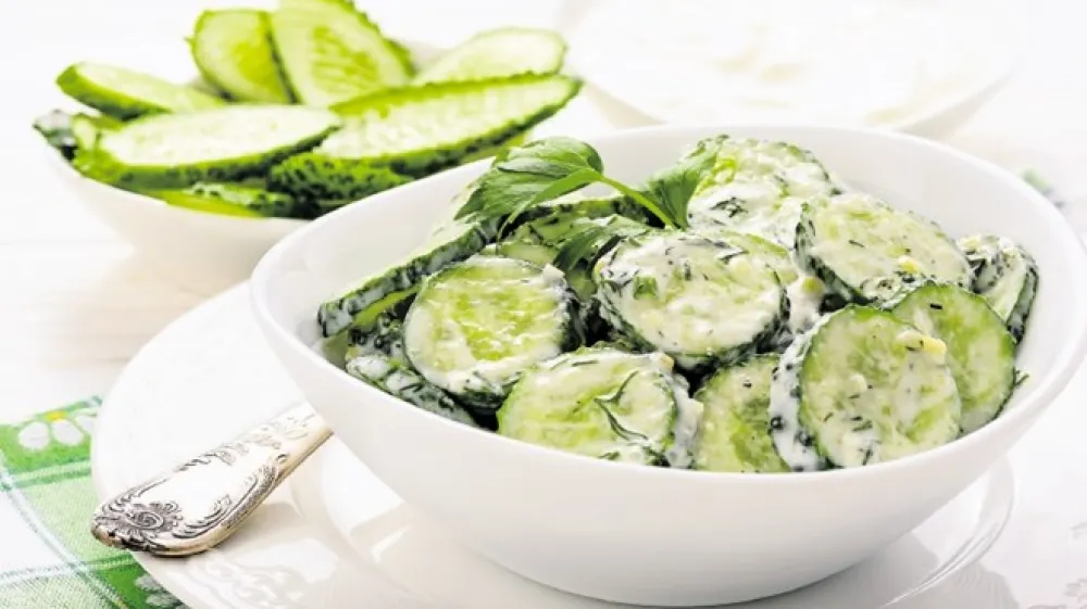 Potrebujemo 750 g svežih kumar, 1 večjo čebulo (ali ustrezno količino mladih čebul z zelenjem vred), 50 g razkoščičenih črnih oliv, 250g sira feta, 2 žlici oljčnega olja, 2 žlici kisa, 2 žlici sladkorja, 1 žličko morske soli (precej slana je že feta), sveže zmlet črni poper, 2 žlici sesekljanih listkov poprove mete.