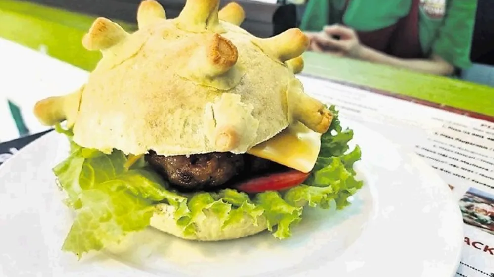 Šal na temo koronavirusa na družbenih omrežjih ne manjka, temu trendu pa se je pridružil tudi kulinarični svet. Kuharji in peki so namreč začeli ponujati jedi, povezane z epidemijo koronavirusa. V Hanoju v Vietnamu je v restavraciji Pizza Homa glavni kuhar Hoang Tung na primer ustvaril koronaburger, ki se od običajnega burgerja razlikuje v tem, da ima kruh, obarvan z zelenim čajem, majhne krone, tako da spominja na koronavirus. »Pri nas obstaja šala, da če se nečesa bojiš, to poješ,« je povedal Tung za Reuters. V Franciji pa je slaščičar Jean-François Pré ustvaril velikonočna jajca na temo korone. Gre za čokoladne pirhe, ki so prekriti z rdeče obarvanimi mandlji, s čimer posnemajo videz virusa pod mikroskopom. Pojavilo pa se je tudi nekaj slaščičarskih domislic na račun tega, kar je s seboj prinesla karantena – nemška pekarna Schuerener Backparadies je tako začela ponujati torte v obliki toaletnega papirja, gredo pa tako hitro kot pravi toaletni papir. tb