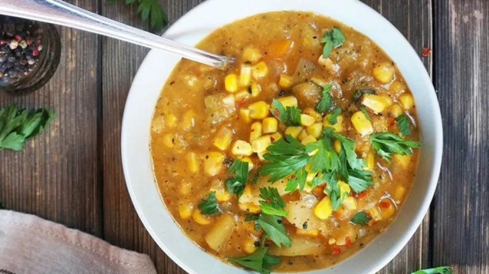 Najprej pripravite vso zelenjavo. Krompir in korenje olupite in narežite na kockice. Zeleno narežite na kolobarčke, čebulo in česen sesekljajte, bučko pa narežite na kocke. Koruzo splaknite pod tekočo hladno vodo in dobro odcedite.