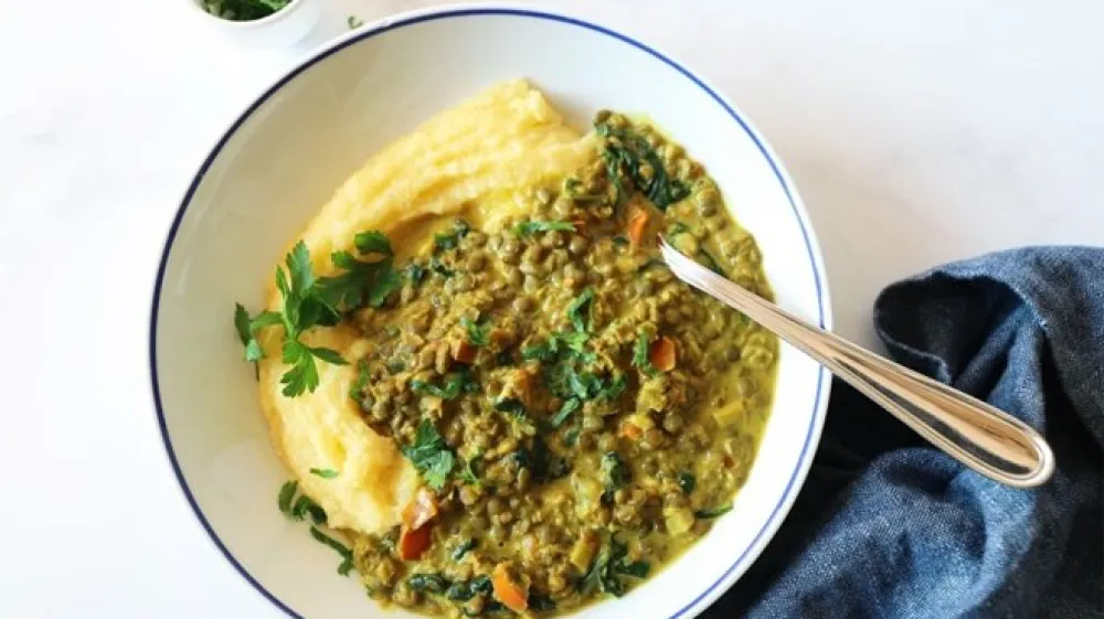Na popečeno zelenjavo stresite splaknjeno lečo in premešajte, zalijte z jušno osnovo in kuhajte toliko časa, da se leča skuha (čas kuhanja preverite na embalaži). Omako občasno premešajte. V omako s kuhano lečo dodajte špinačo, premešajte, dolijte še kokosovo mleko in kuhajte še 10 minut, da se naredi kremna omaka.