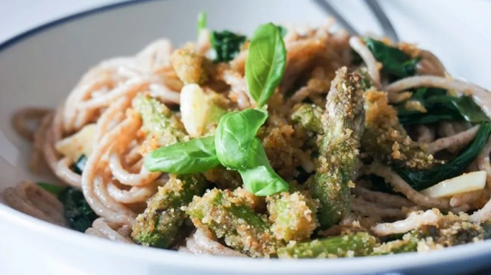 V sezoni špargljev, ki je ponavadi od aprila do junija, maslene špagete nadgradite z drobtinovimi šparglji, izven nje – torej pozno poleti – pa jed pripravite brez njih. Na maslu popražite drobtine, jim po želji dodajte nariban strok česna in malo soli in popra ter špagete potresite le z njimi. Vseeno bo jed fantastična!