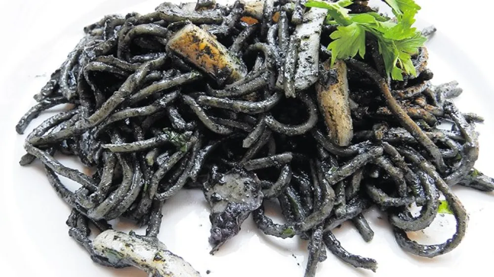 Denimo, da nam ne tekne niti hobotnica, zamrznjeni lignji z drugega konca zemeljske oble pa nas ne prepričajo. Izbor je s tem postal res ozek in še najzanesljivejša izbira se v tem primeru zdi sipa. Ta glavonožec z desetimi lovkami je zanimiva pojava, saj je sposoben spreminjati barvo, zaradi česar mu pravijo tudi morski kameleon. Zanimivo je, da sipe vsebujejo dve sestavini, primerni za pisanje ali risanje. Prva je črnilo rjavkasto črne barve, imenovano tudi sepija, s katerim lahko ne le pišemo, ampak si z njim denimo obarvamo morsko rižoto, da je črna kot iz dimnika. Poleg črnila sipa premore tudi kost, ki jo je podedovala od svojih prednikov, ki so imeli koščen oklep ali lupino. Takšna kost je podobna kredi in lahko z njo pišemo po tabli ali asfaltu, vesele pa so je tudi papige, ki si na njej brusijo kljun. Če želimo razmeroma hitro in enostavno pripravljeno kosilo, zavijemo v ribarnico in zahtevamo očiščeno sipo. Zrežemo jo na koščke in primešamo sesekljanima čebuli in česnu, ki dišita iz vroče ponve. Ko se sipa malo popraži in tekočina povre, vse skupaj presenetimo s kozarcem vina (enega med vihtenjem kuhalnice privoščimo še sebi). Zraven naj padejo kakšen lovorov list, morda žlica sesekljanega peteršilja in zavojček sipinega črnila. Zelo počasi naj se kuha, da vino povsem povre in se črna omaka zgosti, sipa pa zmehča. Medtem na zob skuhamo čim bolj debele špagete ali široke rezance. Odcedimo jih in pomešamo s črno omako. Nastanejo krasni, med sladokusci silno čislani špageti s sipo na črno (na fotografiji), ki jih le še posujemo z malo sesekljanega peteršilja in sveže naribanim parmezanom. Sipino črnilo sicer prodajajo v ribarnicah in v skoraj vsaki veleblagovnici; po navadi ga najdete v hladilniku blizu vloženih filetov inčunov in rezin dimljenega lososa … Črnilo gor ali dol, bistvene spremembe okusa z njim ne bomo dosegli, pri tem gre namreč predvsem za estetske užitke. Če še vedno ne vemo, kaj bi s sipo, ki nas čaka v hladilniku, pa si velja zapomniti, da jo lahko pripravimo tudi po receptih za lignje (tudi ocvrte) ali hobotnico. Kdor nerad zapleta stvari in živi po načelu manj je več, lahko sipo nareže na kose in jo skupaj s koščki čebule (podobno kot jetrca) na hitro popeče v ponvi, zraven pa ponudi denimo popečene bučke in oljke. Ljubitelji jedi na žlico pa iz sip skuhajo počasi brbotajoč brodet oziroma golaž, morda po tokratnem receptu. Če se nam za prilogo ne ljubi pripravljati popečene polente, bo dober domač kruh popolnoma zadostoval. Celo prednost ima – z njim boste lahko krožnik pomazali do suhega!