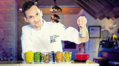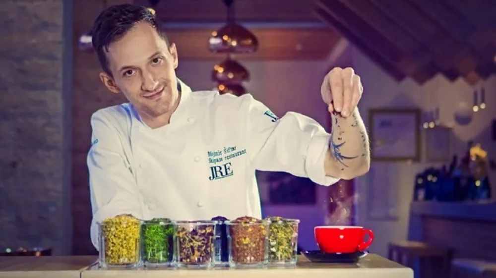 Stičišče ljubiteljev smučanja in dobre jedače je, odkar je kuhinjo prevzel ta 25-letnik, postalo prostor, ki kipi od ustvarjalnosti in zanimivih okusov, v katere sta pogosto vmešana tudi čaj, ko gre za sestavine, in dimljenje, ko gre za kuharsko tehniko. File romba s črnim čajem, polenovka, ki se je poširala v devetih zeliščih iz čaja, in maslo s kamilico so le nekateri od primerov čajnega eksperimentiranja, ko govorimo o dimljenju, pa boste prej ali slej naleteli tudi na kaj tako nenavadnega, kot je dimljeni jogurt.