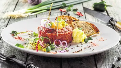 Čim bolj ohlajeno očiščeno meso narežemo na drobne koščke, jih posolimo in popramo. Inčunove filete stremo. Kapre drobno sesekljamo. Narezano meso z zelo ostrim nožem drobno sesekljamo ali grobo zmeljemo v dobro ohlajenem stroju! Dodamo vse preostale sestavine po navedenem vrstnem redu, dobro premešamo in na ohlajenem krožniku poljubno oblikujemo. Obložimo s kosmi masla, oljkami, kaprami, slanimi fileti, čebulo in podobnim, po želji tudi z dodatnim surovim rumenjakom, ponudimo pa z doma pripravljeno majonezo, pikantnimi dodatki in različnimi opečenimi kruhki. Odlična priloga je tudi ocvrt krompirček.