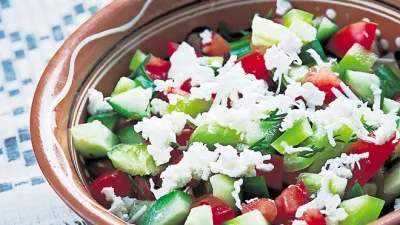 PripravaV veliko skledo na kocke narežemo paradižnik, (olupljene) kumare, papriko in čebulo, če dodamo feferon, ga narežemo na kolesca in po želji razsemenimo. Če dodamo peteršilj, ga drobno sesekljamo in stresemo v skledo. Vse skupaj prelijemo z oljem, rahlo solimo in popramo, prelijemo še s kisom, premešamo in v hladilniku mariniramo vsaj dve uri. Nato solato še enkrat dobro premešamo in na vrh naribamo (če je to možno) ali nadrobimo sir (lahko tudi feto). Postrežemo kot samostojno jed skupaj z dobrim domačim kruhom, še posebno pa se prileže k jedem z žara.