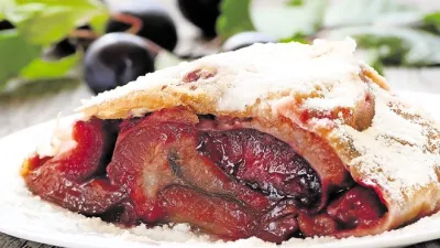 PripravaSlive operemo, razkoščičimo in narežemo na četrtine. Posujemo jih s sladkorjem, postrgano vsebino stroka vanilje in cimetom, pobrizgamo s slivovko ter premešamo. Pekač obložimo s papirjem za peko. Pečico segrejemo na 200 stopinj Celzija. Liste testa namažemo s 100 g masla, posujemo z orehi in drobtinami ter nadevamo s slivami. Testo zvijemo v zvitke in jih položimo v obložen pekač ter premažemo s preostalim maslom. Za pol ure porinemo v segreto pečico, da se zlato rumeno zapeče. Ko se zavitek nekoliko ohladi, ga narežemo, posujemo s sladkorjem v prahu in ponudimo s kepico sladoleda.