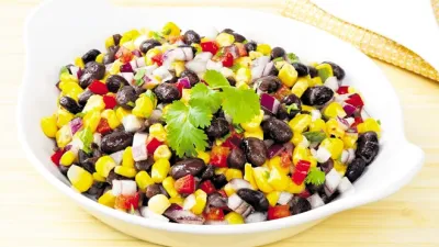 Koruzo in fižol odcedimo in stresemo v solatno skledo. Peteršilj operemo in nasekljamo. Papriko operemo, ji odstranimo semena in narežemo na kocke. Čebulo očistimo in nasekljamo ali grobo narežemo. Česen olupimo in drobno nasekljamo. Večjo ponev pristavimo in segrejemo, v njej razpustimo maslo, dodamo papriko, čebulo in česen. Začinimo s čilijem (ali poprom), solimo in pražimo 5 minut, medtem pa ves čas mešamo. Praženo mešanico še vročo stresemo v skledo ter dodamo olje, kis (lahko tudi sok limete) in nasekljan peteršilj. Dobro premešamo in postrežemo.