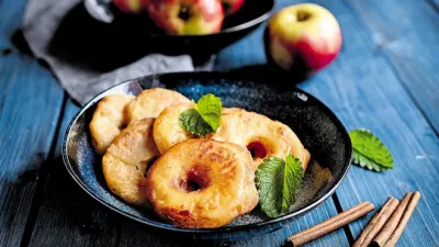 PripravaV skledo presejemo moko in jo zmešamo s pecilnim praškom, sladkorjem v prahu, soljo, muškatnim oreščkom in cimetom. Prilijemo jabolčnik, dodamo razpuščeno maslo in razžvrkljano jajce ter dobro premešamo, da dobimo popolnoma gladko in gosto tekoče testo. Pustimo ga počivati nekaj minut. Jabolka olupimo in izdolbemo peščišča. Narežemo jih na centimeter debele kolobarje in jih pokapamo z limonovim sokom. Pomakamo jih v testo ter jih v segretem olju na obeh straneh zlato rjavo ocvremo. Ocvrte kolobarje odlagamo na krožnik, obložen s papirnatimi brisačami.