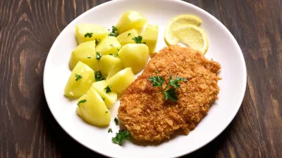 Telečje zrezke nežno potolčemo s kladivom za meso, da so enakomerno tanki, pri čemer pazimo, da mesnih vlaken ne trgamo. Udarjamo rahlo, najbolje pod folijo za živila. Zrezke začinimo na obeh straneh s soljo in kančkom popra ter jih spaniramo. V večji ponvi segrejemo mast na približno 170–175 °C, pri čemer pazimo, da zrezki plavajo v maščobi, kar je ključno za pravo strukturo. Cvremo po dva zrezka naenkrat, 2–3 minute na vsaki strani, dokler ne postaneta zlatorjava in hrustljava. Ocvrte zrezke položimo na rešetko, ne na papirnate brisače, da ostanejo hrustljavi, sicer se lahko navlažijo. Takoj jih serviramo s krhljem limone in peteršiljevim krompirjem, ki ga pripravimo tako, da kuhanemu krompirju primešamo stopljeno maslo, sesekljan peteršilj in sol.