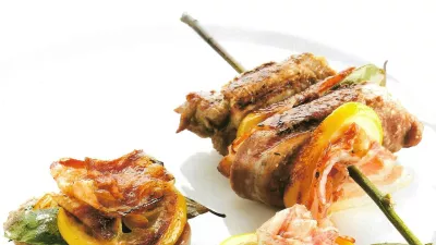 Če imamo cele vejice lovora, jih osmukamo, če ne, pripravimo lesene palčke, da bomo nanje nabadali medaljone. Svinjske koščke mesa solimo, popramo in jih v večji posodi zmešamo z vinom, oljčnim oljem, lovorovi listi in rezinami limone. Na vsak medaljon položimo rezino slanine in limone ter list lovora in jih nabodemo na palčko hrustljavo ter jih na vsako strani v ponvi ali namiznem žaru pečemo osem minut oziroma toliko časa, da slanina postane hrustljava, meso pa dobro pečeno. Kot priloga se bo podal pečeni krompir ali rizi-bizi.