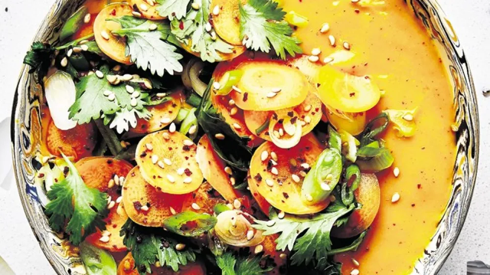 4Korenček ostrgamo in nalistamo na čim tanjše rezine, idealno je 0,5 milimetra. Stresemo jih v manjšo skledo, prelijemo z limonovim sokom in malo solimo. Dodamo žličko kosmičev sušene paprike (ali zelo na drobno nasekljano svežo rdečo papriko), žlico praženih sezamovih semen in pest nasekljanih listov peteršilja ter premešamo kot solato. Juho razdelimo v skodelice in tik pred serviranjem obložimo s solato iz nalistanega korenčka in peteršilja.