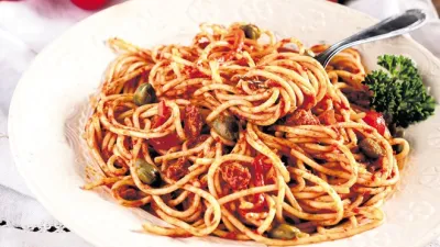ŠPAGETI S TUNINO, PARADIŽNIKOM IN KAPRAMI
