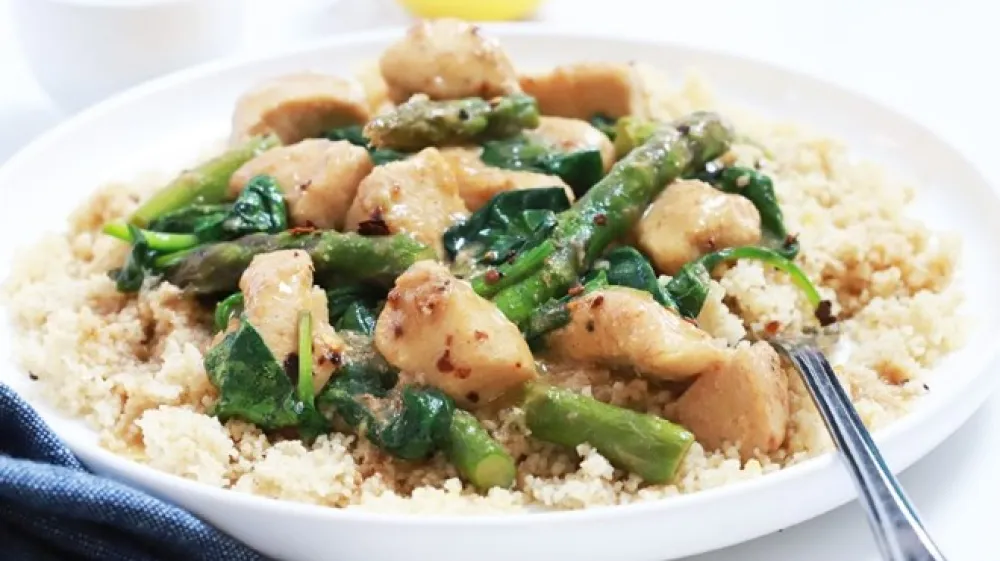 Ta pisana jed, polna mehkih koščkov piščanca in odlične zelenjave, je nadvse okusna in pripravljena v slabe pol ure! Postrezite jo s kuskusom, kruhom, riževimi rezanci ali rižem in enostavno le uživajte. Zunaj sezone špargljev jed pripravite brez njih, nadomestite jih lahko z brokolijem.