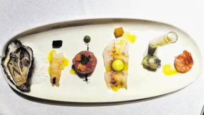 Naslednja jed je pravzaprav četa morskih prigrizkov: ostriga s kremo pasijonke, surov škamp s kaviarjem ter bombonom sipine juhe, tartar tune s pomarančo in res močnim vasabijem, brancinov karpačo z oljčnim oljem ter bombonom ribje in paradižnikove juhe, rezanci surove sipe s kremo brokolija in rdeči gamber na oljčnem olju. Ko pridete do konca, vas čaka »labelo« s pasijonko za osvežitev.