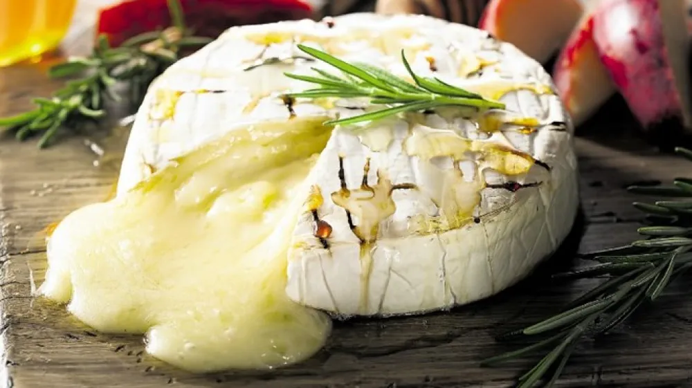 Najprej karameliziramo orehe. Pekač obložimo s papirjem za peko. Suho ponev segrejemo in vanjo stresemo orehe. Prilijemo javorov sirup, dodamo ščepec soli in mešamo, da se sirup zgosti, blago karamelizira in prevleče orehe. Pazimo, da ga ne zažgemo! Karamelizirane orehe stresemo v pekač. Na hitro jih ločimo, še preden se zlepijo. Ohladimo jih pri sobni temperaturi. Pečico ogrejemo na 180 stopinj Celzija. Sir iz embalaže preložimo na sredino manjšega ognjevarnega pekača. Obložimo ga z rožmarinom in izdatno pokapljamo z medom. Pekač položimo v ogreto pečico za 10–12 minut, da postane sir mehak na otip. Medtem pripravimo opečene kruhke. Pečeni sir vzamemo iz pečice in ga nekaj minut hladimo. Nekaj rožmarinovih iglic čim bolj drobno sesekljamo. Rožmarinove vejice odstranimo od sira in po njem posujemo svež sesekljani rožmarin, nazadnje ga pokapljamo z medom. Praznično jed, idealno za prijetno druženje, ponudimo s hrustljavo popečenim kruhom in karameliziranimi orehi.