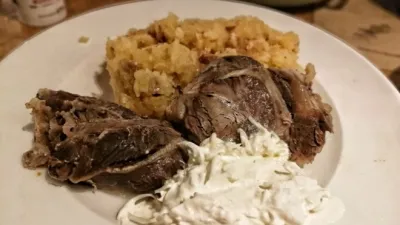 Raje smo naročili Fornazaričev rubino. Gre za zvrst merlota in caberneta sauvignona, ki je zaradi dodatka sušene vstopne surovine precej všečen. Polsuho vino se je srečalo s tremi velikimi razočaranji večera, najprej s kuhanim govejim bočnikom sumljivo temne barve, ki je bil gotovo tudi presuh in mu tudi praženi krompir in hren nista pomagala.