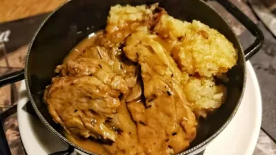 Pri po nepotrebno »razstavljenem« ljubljanskem zrezku si je ambiciozni avtor recepta zamislil, da bi ocvrto meso prelil s sirovo omako – ocvrta skorja in polivka še nikoli nista bili dobra kombinacija. In tudi premastna telečja pečenka, ki so jo s praženim krompirjem vred postregli v globoki ponvi (kako naj človek to normalno jé?) ni popravila vtisa. Kaj je bilo dobro? Radič, zabeljen s krompirjem in ocvirki.