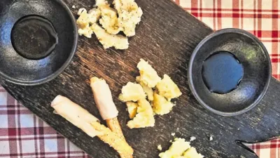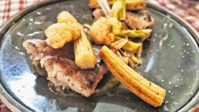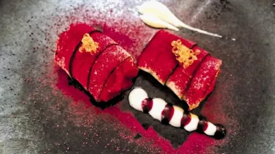 Pod stopnicami sami pečejo gost kruh, ki spremlja zanimive izume, a je treba priznati, da je kar nasiten in se ga je treba paziti, da ne moti scenosleda. Scenosleda, v katerem je za začetek poskrbela barvno živahna hladna predjed: v bučke zavita postrv s hrenovo majonezo in prahom rdeče pese ter postrvjimi ikrami.