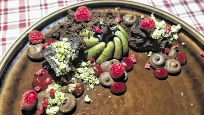 Nato smo se vendarle odkotalili proti sladici. Pustili smo si natočiti Blažičevo rdečo zvrst, čeprav smo z njo zalili panakoto z bučnim oljem in čokoladnim drobljencem, svežimi in dehidriranimi malinami, prahom bučnega olja in še bučnim oljem povrhu. Spet skoraj preveč zapleten krožnik, ki mu pri kombinaciji okusov ni bilo mogoče prav ničesar očitati.