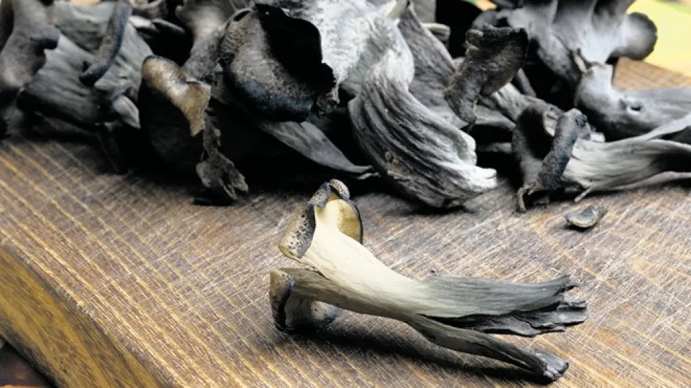 Nabranih gob načeloma ne podarjamo, kvečjemu cele, da jih je mogoče prepoznati, kar je v primeru, da jih prej očistimo in zrežemo ali celo že vložimo, nemogoče. Zastrupitve z gobami so namreč precej pogoste, zato podarjanje gob pomeni veliko odgovornost, za podarjenega pa tveganje. Večino običajnih gob, kot so jurčki, lisičke, dežniki in podobno, pozna vsak ljubiteljski gobar in jih vsakdo rad vidi na svojem krožniku, obstajajo pa tudi gobe, ki so užitne in okusne, številni pa se jim izogibajo le zaradi videza ali celo imena. Lep primer je črna trobenta, za katero marsikdo misli, da ni užitna. Njeno ljudsko ime je namreč mrtvaška trobenta, kar vzbuja odpor, svoje pa doda njena v vlažnem vremenu črna barva. Najraje raste pod bukvami, hrasti in kostanji, in to v skupinah, tako da jih hitro naberemo za polno košaro. Črne trobente so izjemno okusne in aromatične sveže, pogosto jih tudi sušijo in meljejo za začimbe gobovim, mesnim in drugim jedem. Po kakovosti so primerljive z lisičkami, nekateri jih celo zamenjujejo z užitnimi sivimi lisičkami, ki so jim precej podobne, le trosovnico imajo letvasto, trobente pa gladko. Ko se pred nami znajdejo črne trobente, se torej ne zmrdujmo, temveč iz njih pripravimo kaj slastnega. Enostavno jih popražimo na čebuli oziroma česnu, enako kot lisičke ali jurčke. Če dodamo še riž in vse skupaj zalijemo z vodo, nastane okusna rižota. Včasih kdo stori kapitalno napako in rižoto iz okusnih gob namesto z vodo zalije z juho. Arome so tako seveda močnejše, ampak tista osnova nežna aroma, ki jo prispeva izbrana goba, se povsem izgubi med vsemi drugimi. Mar ni škoda? Zanimiv je gobov praženec, za katerega pripravimo enako testo kot za cesarski praženec, le da ga ne sladkamo, tudi začinimo ga povsem drugače, saj mu namesto cimeta dodamo poper in peteršilj. S takšnim testom debelo zalijemo narezane in s čebulo popražene trobente ter popečemo z obeh strani in natrgamo kakor navaden »šmorn«. Če takšno jed postrežemo s solato, nastane imenitno kosilo. Še enostavneje je na maslu na hitro popražiti narezane trobente, jih zaliti z razžvrkljanimi jajci in primešati malo smetane. Na tak način nastane imenitna obloga za (popečen) kruh ali hrustljavo zapečen krompir iz pečice.