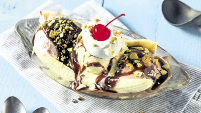 Vaniljev strok vzdolžno razpolovimo in sredico izpraskamo v sladko smetano, ki jo trdo stepemo. Banane olupimo in vzdolžno razpolovimo ter razdelimo na krožnike. Takoj jih pokapljamo z limonovim sokom. Med dve polovici banane damo po eno kepico vaniljevega, čokoladnega in jagodnega sladoleda ter vse skupaj pokapljamo s čokoladnim prelivom. Posujemo s praženimi mandljevimi lističi in na vrh nadevamo stepeno sladko smetano (ki jo lahko prelijemo s tankimi curki medu ali pokapamo z ohlajenim čokoladnim likerjem) ter obložimo s kandiranimi češnjami.