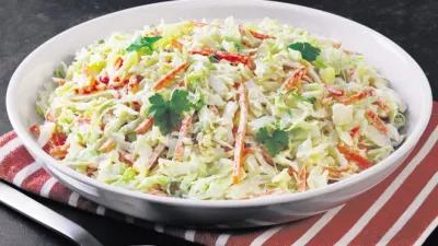 Zelje očistimo in narežemo na tanke rezine ali naribamo. Korenje ostrgamo in naribamo. Čebulo olupimo in narežemo na tanke rezine. Vse stresemo v večjo skledo. V skodelici pripravimo preliv iz majoneze, jogurta, gorčice, soli in popra. Vse sestavine dobro premešamo. S tem prelijemo solato in vse skupaj dobro premešamo. Peteršilj oplaknemo, osušimo in drobno sesekljamo ter posujemo po solati. Pripravljeno lahko takoj postrežemo, še bolje pa, če solato pokrijemo in za nekaj časa postavimo v hladilnik, da se okusi povežejo.