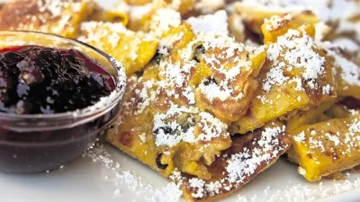 Oprane rozine namočimo v rum. V skledo vsujemo moko, sladkor v prahu, postrgano sredico vaniljevega stroka, dve žlički naribane limonove lupine, sol, jajca, mleko in rozine z rumom. Z mešalnikom zmešamo v gladko redko testo, ki mu primešamo limonov sok. Počiva naj 15 minut. V čim večji ponvi razpustimo maslo in nanj nalijemo testo. Počasi pečemo, da se spodnja stran svetlo rjavo zapeče, zgornja pa zakrkne. Pazimo, da se ne prismodi! Obrnemo in zapečemo še po drugi strani. Z lesenima lopatkama drobno razkosamo, posujemo s sladkorjem v prahu in postrežemo z marmelado.