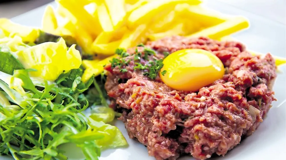 Tatarski biftek je bil zelo priljubljen v Franciji že na prehodu iz 19. v 20. stoletje, težko pa je ugotoviti, od kod zares izvira. Kot sesekljano meso z začimbami in jajčnim rumenjakom ga opisuje kuharska enciklopedija iz leta 1938, viri iz leta 1921 pa kot surovo sesekljano meso s tatarsko omako ob strani. Tatarski biftek so izvirno, še preden se je imenoval biftek, kar v resnici pomeni goveji zrezek, izdelovali iz konjskega mesa. Prav nobene ovire ni, da ga iz tovrstnega mesa ne bi pripravili tudi danes. Ali pa iz fileja lososa oziroma tuna. V naših krajih ga tradicionalno postrežemo ob še vročih hrustljavo popečenih rezinah kruha z maslom, Francozi in Belgijci pa si to surovo delikateso privoščijo s prvovrstnim ročno narezanim ocvrtim krompirjem – tatarski biftek namesto s popečenim kruhom jedo z vrhunskim domačim pomfritom. Morda s preizkušeno odlično kombinacijo presenetite za praznično večerjo, le nikar se ne osramotite s cenenim zamrznjenim pomfritom iz samopostrežne…