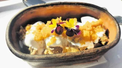 Konkretno vino, sicer najljubša kapljica šefa gostilne Dina Kruhoberca, je imelo priložnost sodelovati pri toplih predjedeh. Pomalicali smo vinogradniške polže s tržaško omako, ki so bili izvrstni. Morda bi morali pokusiti še žabe, a smo se tokrat odločili za ajdove žgance, saj je Taverna ena redkih gostiln v Sloveniji, kjer jih še kuhajo. So bogato obdani tako s smetano kot z ocvirki, treba se je izpogajati za najmanjšo mogočo porcijo, drugače boste težko nadaljevali, nadaljevati pa se vsekakor izplača.