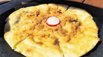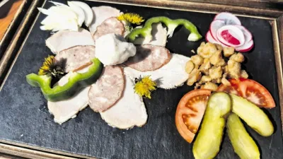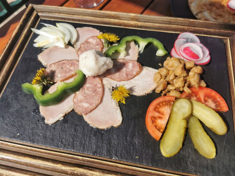 Med predjedmi je treba omeniti vso široko ponudbo, čeprav je ni štiričlanske ekipe, ki bi lahko pojedla vse te prleške užitke. Karpačo, šunka, klobasa, ocvirki, zaseka, zelenjava, kravji sir, domač pršut, tatarski biftek… Na mizo smo dobili malo postržjačo z ocvirki, ki ji pravijo prleška pica, in z njo podprli domač mladi sir z bučnim oljem ter taisti sir s sladko papriko, oboje opremljeno s sirovim čipsom. Vzeli smo še manjšo, degustacijsko različico narezka z mesom iz tunke, klobaso in zaseko ter svežo redkvijo, papriko in čebulo. Za piko na i sta v kozarcih brbotali Kupljenovi penini – ena iz renskega rizlinga, rožnata sestra pa iz modrega pinota. Sveža kapljica za topel, še ne vroč pomladanski dan.