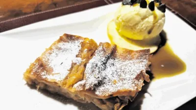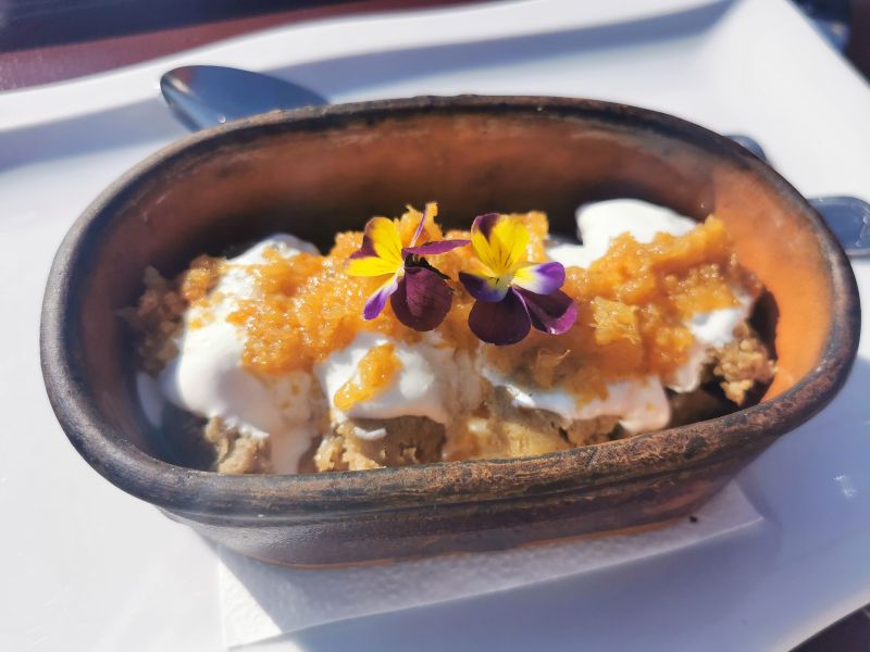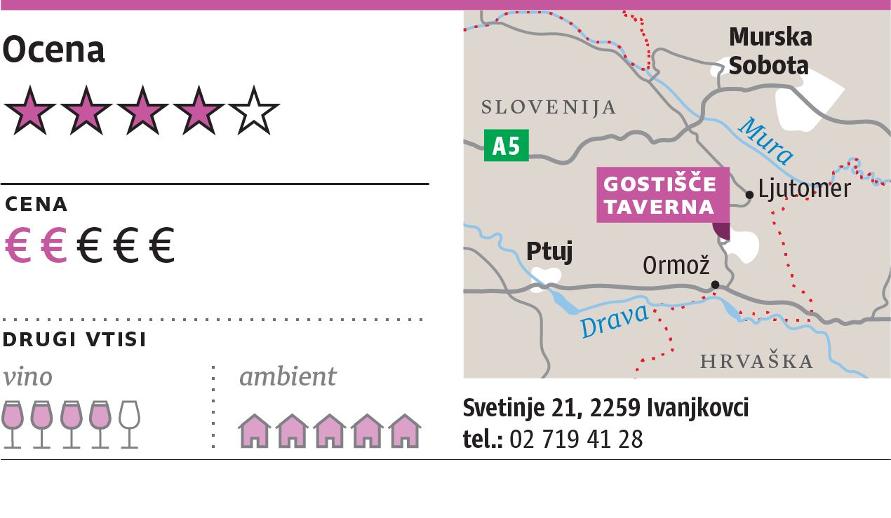 Pa sladice? V Taverni so ponosni na svoje prleške jedi, kar pomeni, da gibanica ni bogata prekmurska, temveč skutna prleška, nedvomno pa se splača pokusiti tudi druge posebnosti, kot sta ajdova pogača in domača kvasenica. Ne nazadnje pa ni nič slabša izbira klasičen jabolčni zavitek, ki mu dodajo vaniljev sladoled z bučnim oljem. Pomalicali smo ga v sekundi.