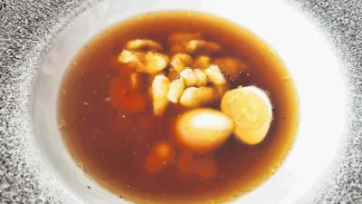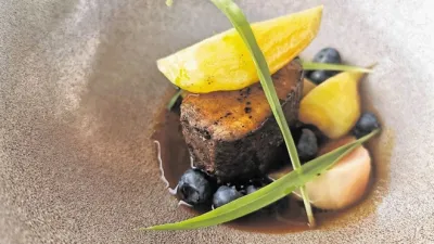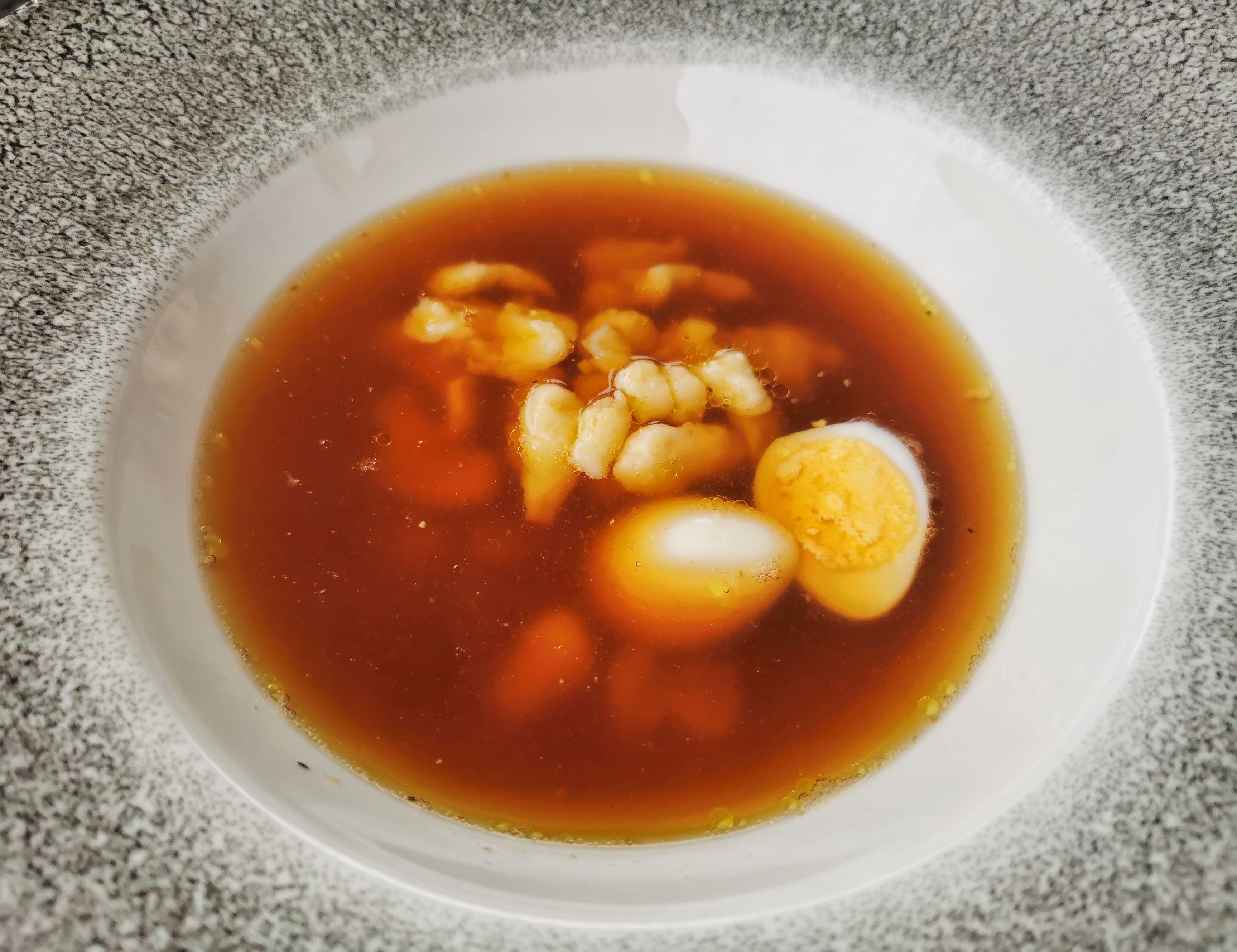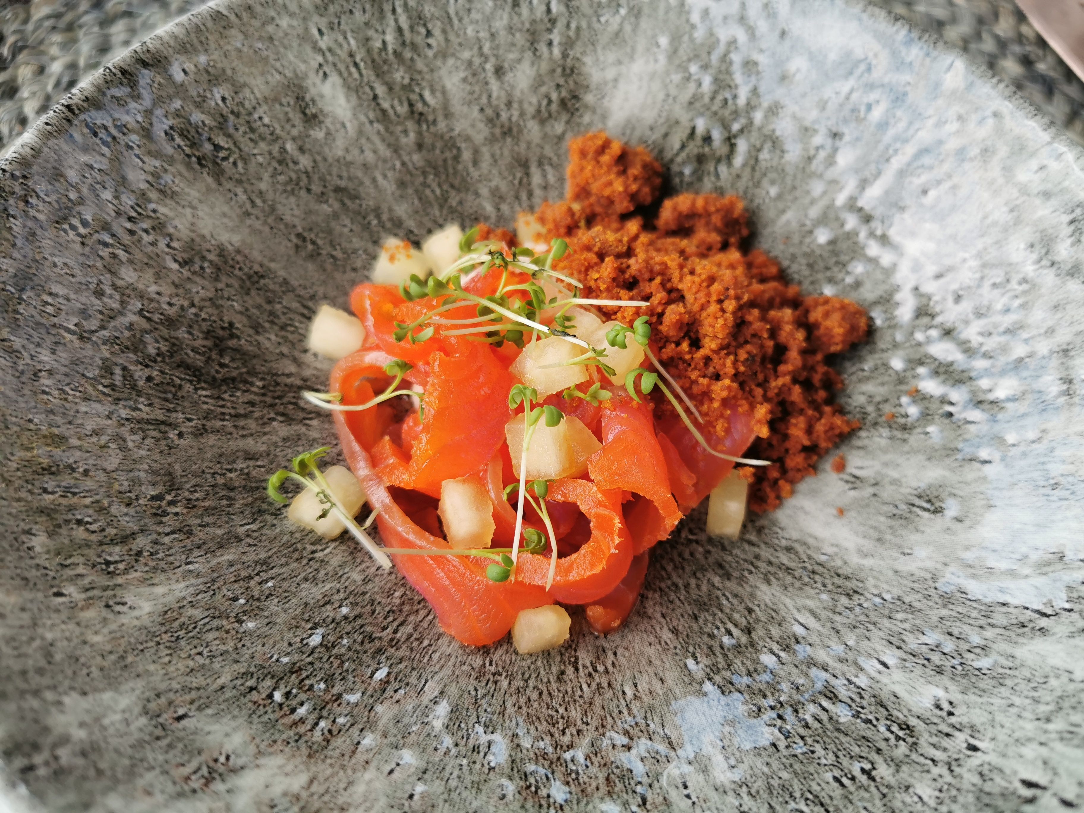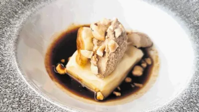 Kot prvo jed menija smo predse dobili dimljeno postrv z drobtinami rjavega masla, kockami jabolka, pirejem gomoljne zelene in gorsko krešo. Osvežilna, čeprav zapletena jed. In to se ni spremenilo niti pri naslednjih jedeh. Mojstri v kuhinji so bližje avtorskim, kreativnim receptom kot raziskovanju lokalnega. Sirov štrukelj v dašiju jezerskega čaja z lešnikovo kremo, drobljenimi lešniki in vloženimi jurčki – izjemno povezani okusi, daši jezerskega čaja pa se samo sliši oddaljeno. Manj avtorska, manj zapletena je bila zelo koncentrirana in redko kje tako okusna prepeličja juha z vlivanci in prepeličjim jajcem.