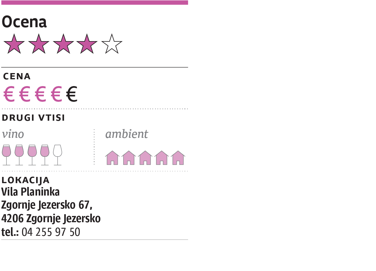 V Planinki ponujajo menije s štirimi, petimi ali sedmimi jedmi, a prav vseh ni mogoče naročiti. Nam so recimo meni s petimi jedmi zaračunali tako, da so tistemu s štirimi dodali polno ceno še ene jedi. Meni, ki naj bi stal 56 evrov, je tako poskočil na 59 evrov za osebo. Matematika, ki zbega, po drugi strani pa menija s sedmimi jedmi (74 evrov) ne strežejo kar tako in ga je treba prej naročiti. Kdaj prej, tega nam ni uspelo izvedeti.