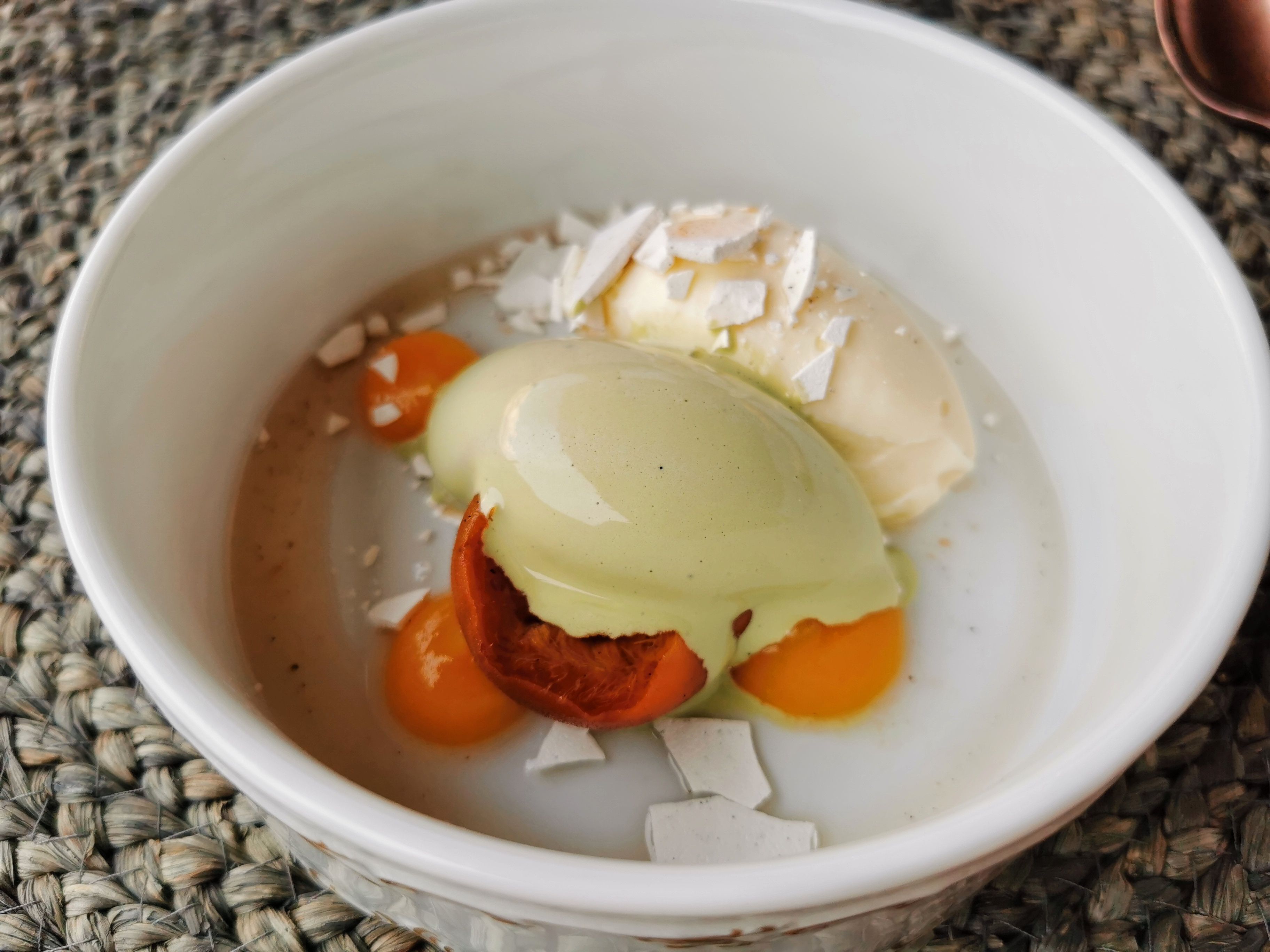 Vrnimo se k hrani. Glavna jed je bil sicer mehak, ravno prav opečen kos jelenovega mesa, opremljenega s peso in borovnicami na demi-glace omaki. Morda je bila še največja težava, da so meso postregli v skledi, kar je sicer zelo sodobno, malce po azijsko, je pa v takšni posodi težko rezati divjačino ali konec koncev katero koli sestavino. V takšni posodi je bolje servirati sladice, povezane s sladoledom, kot se je izkazalo na koncu obeda, ko so v kuhinji povezali sladoled bele čokolade, sladoled jezerskega čaja, sladke marinirane marelice in vetrce. Pravi poletni recept, bi lahko rekli.