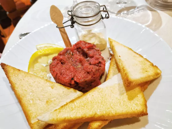 Ob vseh testeninah pa za zmerno ceno, kot smo omenili, ponudijo tudi ducat glavnih jedi, med njimi račko, omenjeni tournedos, lososa in jagenjčka. Našo pozornost je še posebej pritegnila konkretna porcija tatarskega biftka (14 evrov), ki ga naši sosedje radi strežejo kot glavno jed. Marsikje ga tudi rahlo popečejo, v Čedadu pa je bil surov, praktično brez začimb in torej povsem prvinski. Ob kruhu k mesu pristavijo še sijajno gratinirano zelenjavo, ob našem obisku so bili to koromač, mladi grah in ohrovt. Govedina v tatarcu sicer pripada sloviti italijanski pasmi fassona iz Piemonta, malce presenetljivo pa menijo, da gre zraven tudi majoneza, zelo začinjena, kot nekakšna rahla tatarska omaka. Vrhunska jed, zraven katere gre piti recimo kak merlot; hišni stane le dva evra, najboljši ali najdražji merlot na karti vin z gričkov v okolici Čedada pa iz kleti Livia Felluge sprejemljivih 45 evrov.
