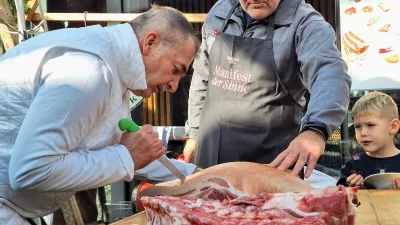 Ob sobotah v novembru Krisplovi na dvorišču svoje restavracije priredijo dogodek, ki se v prostem prevodu imenuje Izmera prašiča (Vermessung der Sau). Zanj zakoljejo certificirano ekološko vzrejenega prašiča, ga razkosajo, pri pripravi in predelavi mesa pa pomagajo tudi gostje, ki za udeležbo plačajo 125 evrov na osebo. Novinar Dnevnika se je lotil razreza maščobe za pripravo ocvirkov. »Bodite pozorni, da režete približno enako velike kocke,« je Krispel podučil skupino amaterskih mesarjev, medtem ko so ženske pri sosednji mizi sekljale česen in ribale hren.