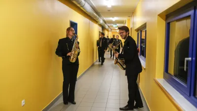 Iz tira je ni vrgel niti odlepljen podplat čevlja enega od godbenikov. »Po 360 letih je že čas, da ga zamenjaš,« so se mu krohotali sotrpini. Ta koncert bo moral še zdržati. V eni od garderob je bila presenetljiva gneča, menda zato, ker so se uglaševali na poseben način. Prišiti je bilo treba še kak gumb in popraviti ovratnik. »Trema je samo, če ne znaš,« so bili enotni mladi tolkalci Adam Brložnik, Arne Kleindienst, Vid Šegina in Maj Carl, ki so imeli pripravljen tudi plan B: »Če se zmotiš, mrtvo hladno naprej.« Arneja je skrbela Uvertura 1812 ruskega skladatelja Čajkovskega, Vida pa Le Chant de l'Arbre Sergea Lancena. »Imam neki čuden solo, ki ga ne razumem, a ker je dolg le dva takta, sem prepričan, da bo šlo,« se je nasmejal. H godbi so prišli po sili razmer, ker je manjkalo bobnarjev, danes je niti po sili razmer ne bi zapustili.