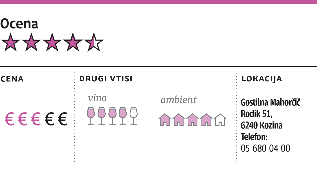 Pri Mahorčiču v slikoviti vasi Rodik, kjer se zavedajo svojih brkinskih, kraških pa tudi vipavskih in istrskih sosedov, razvijajo koncept, ki upošteva lokalne sestavine in jih razvija, kolikor je primerno. Škoda, da v začetku ne ponudijo šampanjca na kozarec, kot so počeli ob našem zadnjem obisku pred nekaj leti. Namesto tega je bila na mizi penina Pallidia iz kleti Sanabor, peneča malvazija, ki je svoje delo opravila dobro. Pravzaprav zelo dobro. Če se ustavimo še za trenutek ob vinski ponudbi, lahko rečemo, da v izboru ob primorskih vinih ne manjka niti šampanjcev niti burgudcev, bordojcev in italijanskih vin.