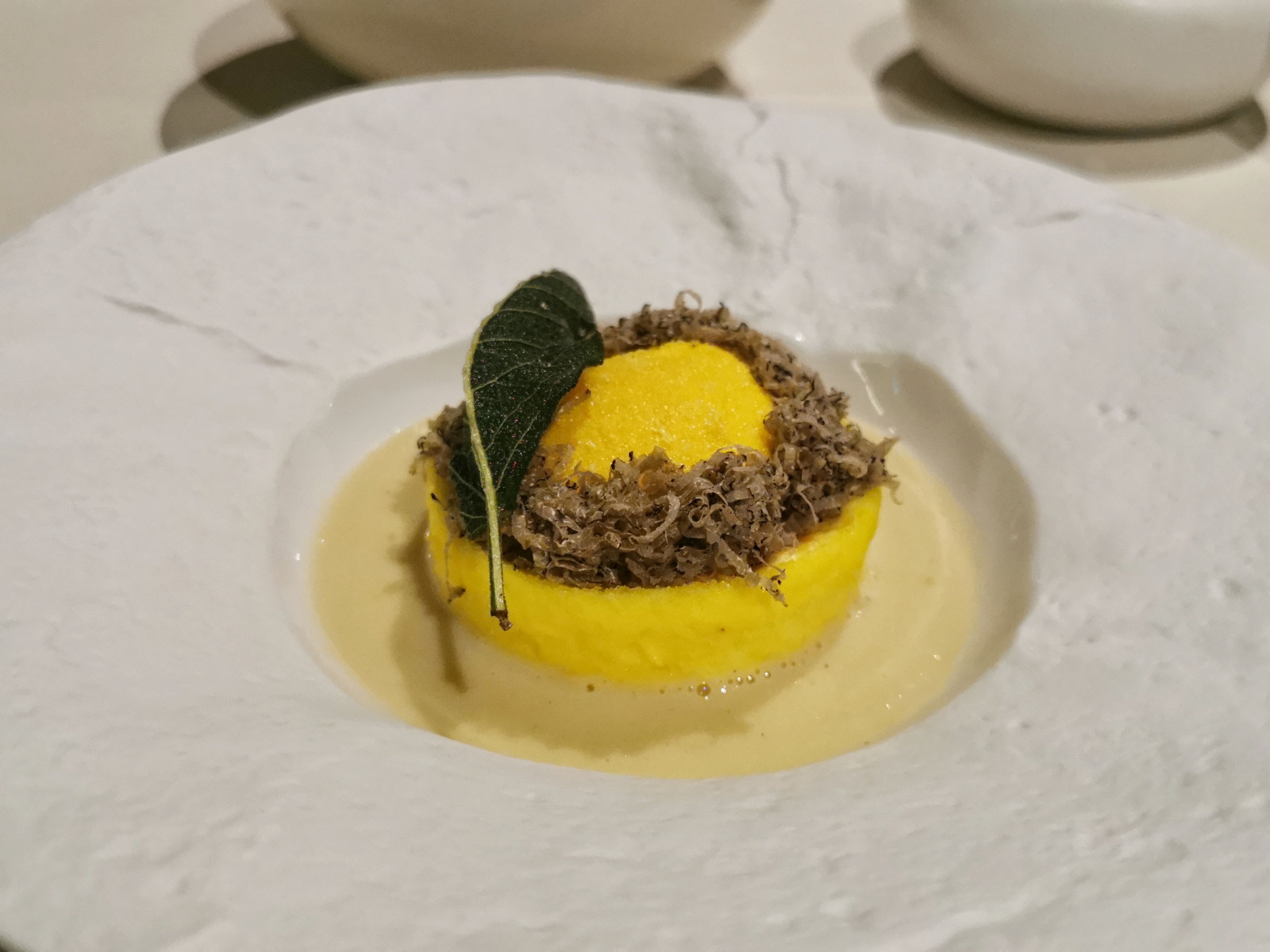 Nasprotje te kombinacije okusov je prva topla predjed, minimalistični čebulni njoki v omaki iz graha in mete z lardom in ocvrtimi listi rdeče pese. Za to izčiščeno in učinkovito jedjo je spet na vrsti bolj zapletena, črno-beli raviol, polnjen z bakalarjem in oblit s čemaževo omako ter mlečno peno s citronko.