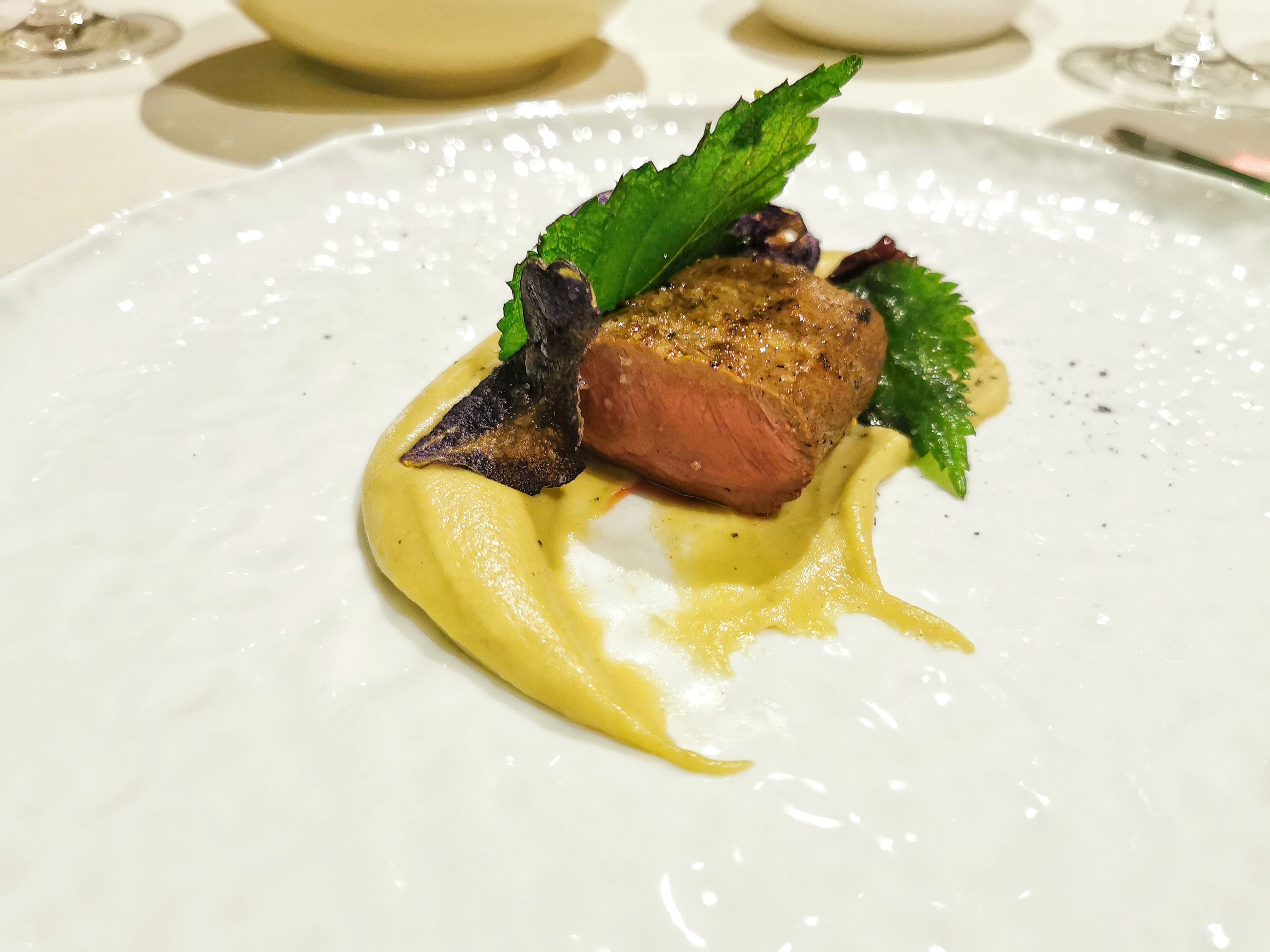 Tretja topla predjed je nedvomno najbolj nasitna v celem scenosledu – flan iz kultnega Zidaričevega sira jamar, ki se sreča z ocvrtim rumenjakom, poletnimi tartufi in omako šalotke. V takšnem primeru, predvsem pa pri prvi glavni jedi pomaga kozarec konkretnega kraškega rdečega. Recimo B +, ki ga iz cele serije rdečih sort (cabernet sauvignon, modra frankinja, merlot, barbera, refošk) prideluje Sebastjan Štemberger. Divjačina je pravzaprav le delni odgovor na takšno ekskluzivno, morda ne ravno široko razumljeno vino. Na krožniku se je tako kos srne srečal z zanimivim krompirjevim pirejem s pistacijo, redukcijo višenj, čipsom vijoličastega krompirja in ocvrtimi koprivami.