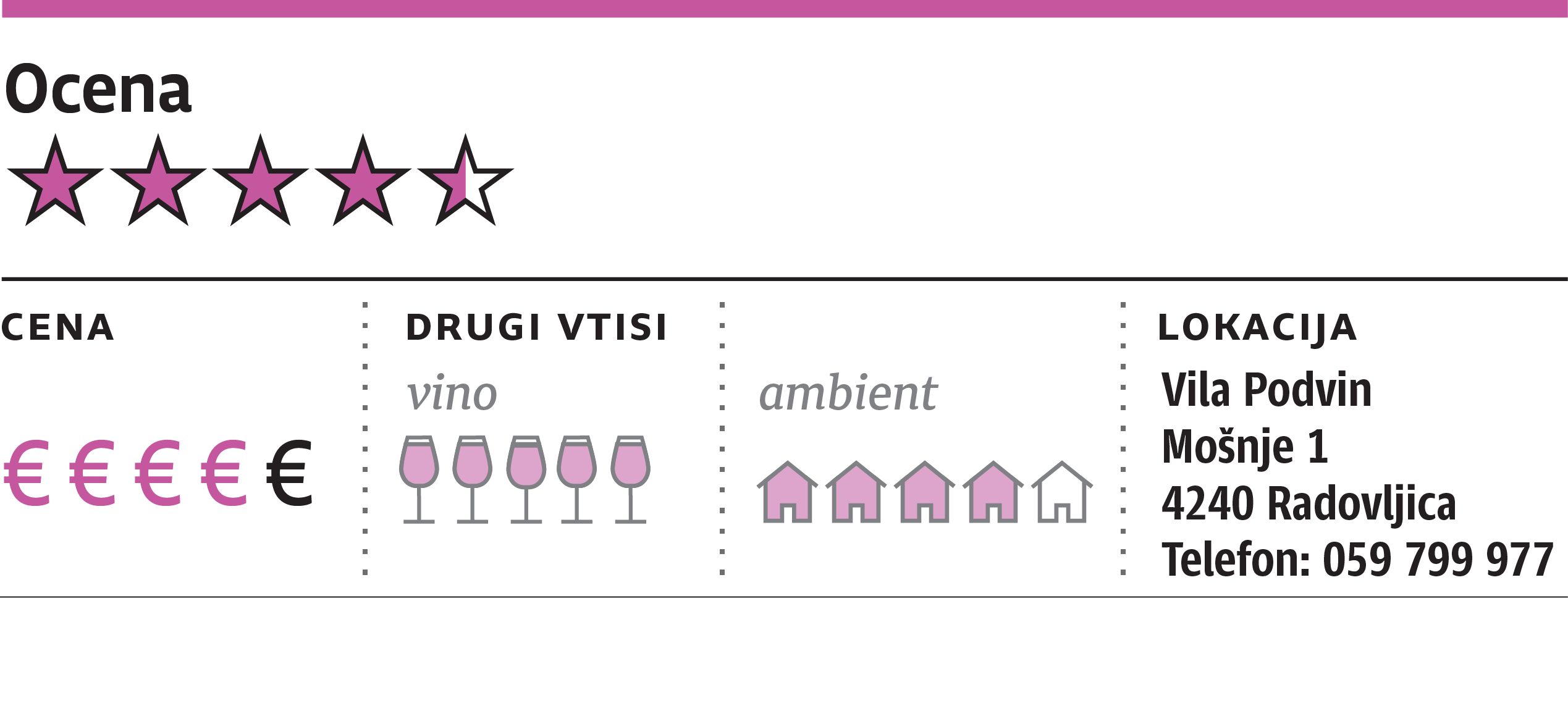 Bi radi še kaj več? Imajo solidno zbirko žganih pijač, a kaj, ko je treba z avtom v Ljubljano. Dobro, potem pa poskusite vsaj Winklerjev zorjen kozji sir. In dobili smo še en vrhunec večera ter hkrati dokaz, da so v Podvinu namesto zapovedane avtorske, lokalne, delno celo avtohtone in skoraj v celoti sledljive kuhinje dobili kuhinjo, ki poudarja sestavine, a gosta ne poučuje o zgodovini in pokrajini, temveč ga želi predvsem zabavati ali, če hočete, zadovoljiti. Tako s kuhanjem kot z ambientom in predvsem z vini.