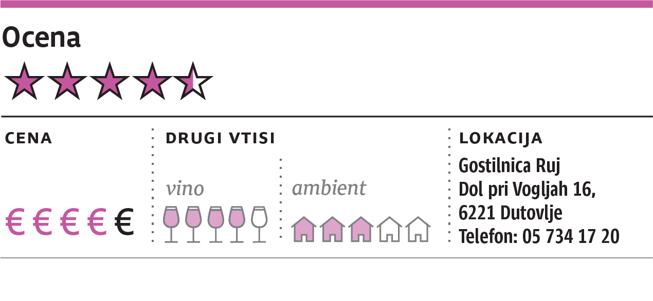 V zadnjem času smo bili sicer pri nekaterih obiskih kraških gostiln na naši strani razočarani, pri Ruju pa smo vedeli, da ne bo tako. A naj takoj na začetku povemo, da utrujena hiška, skupaj z izveskom in notranjostjo vegastih miz, stolov in točilnega pulta, potrebuje prenovo. Tudi časi, ko so gostje še pogledali skozi prste, če gostilna nima jedilnega lista in vinske karte, so davno mimo. Tudi če se ponudba pogosto spreminja, je ni težko napisati ali natisniti na list papirja.